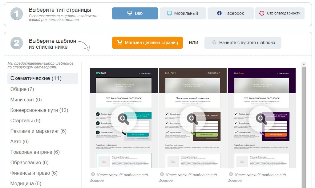 Сразу после регистрации на сайте конструктора вам будет предложено выбрать один из шаблонов оформления landing page: