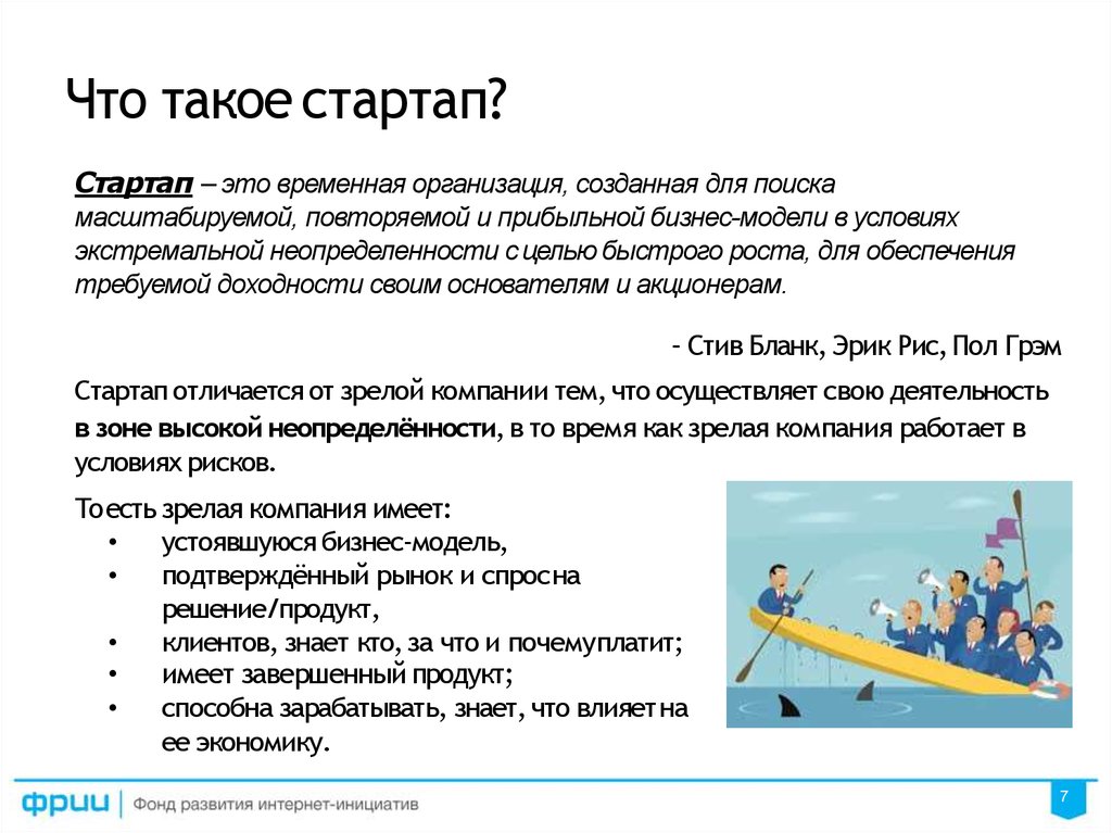 Стартапом называют любые бизнес-начинания, которые как правило имеют незначительную по продолжительности историю развития, и ограниченные ресурсы.
