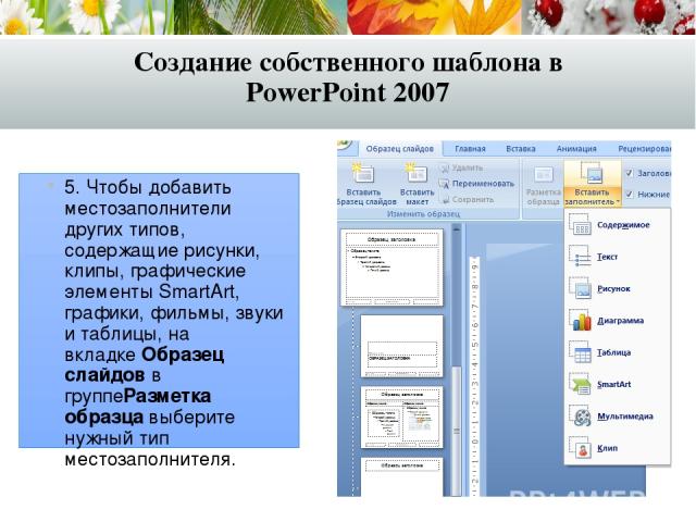 Master ( Мастер ) — в пакете PowerPoint имеются мастера для каждой ключевой компоненты ваших презентаций: слайд-мастер, мастер структуры презентации, мастер раздаточного материала и мастер примечаний. Рисунки и текст, которые вы разместите на этих мастерах, будут автоматически появлятся на каждом новом слайде и страницах примечаний презентации.