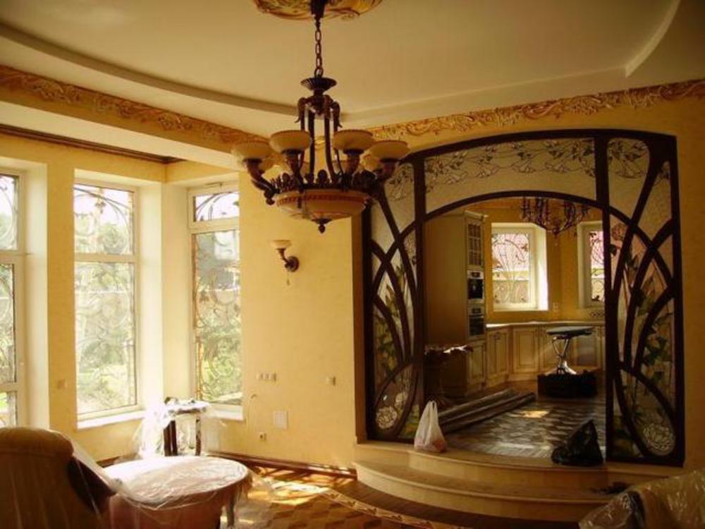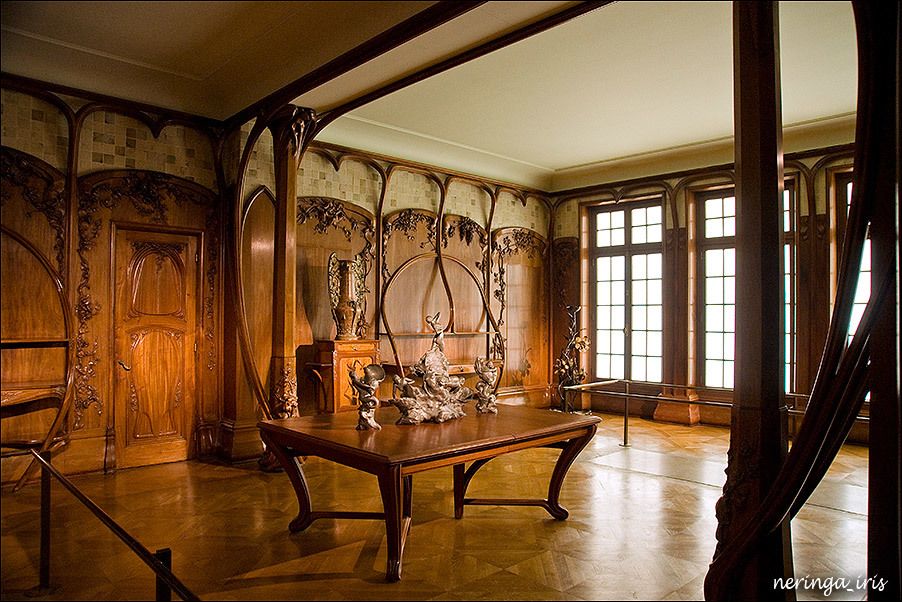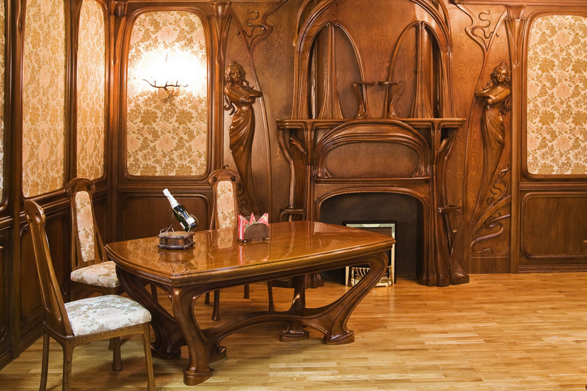 Замысловатый декор — кованые перила, витражи и резные проемы. Обязательные элементы интерьеров в стиле ар-нуво – лестницы с перилами, декорированными кованым растительным узором, резные дверные проемы; всевозможные витражи и особая система освещения. Для дизайна интерьера в стиле ар-нуво (модерн) характерно, когда мебель закрывает собой всю стену.