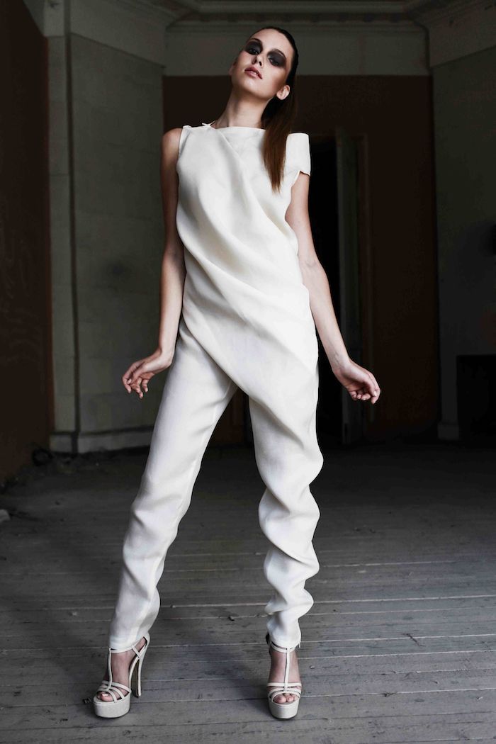 Линия одежды дизайнера состоит из десяти позиций и представляет собой плоские, двухмерные платья, рубашки и брюки, которые можно разворачивать и носить. Ее вещи превращаются в геометрические одеяния одним легким движением: нужно всего лишь потянуть за шлейку, которая заменяет ярлычок производителя.