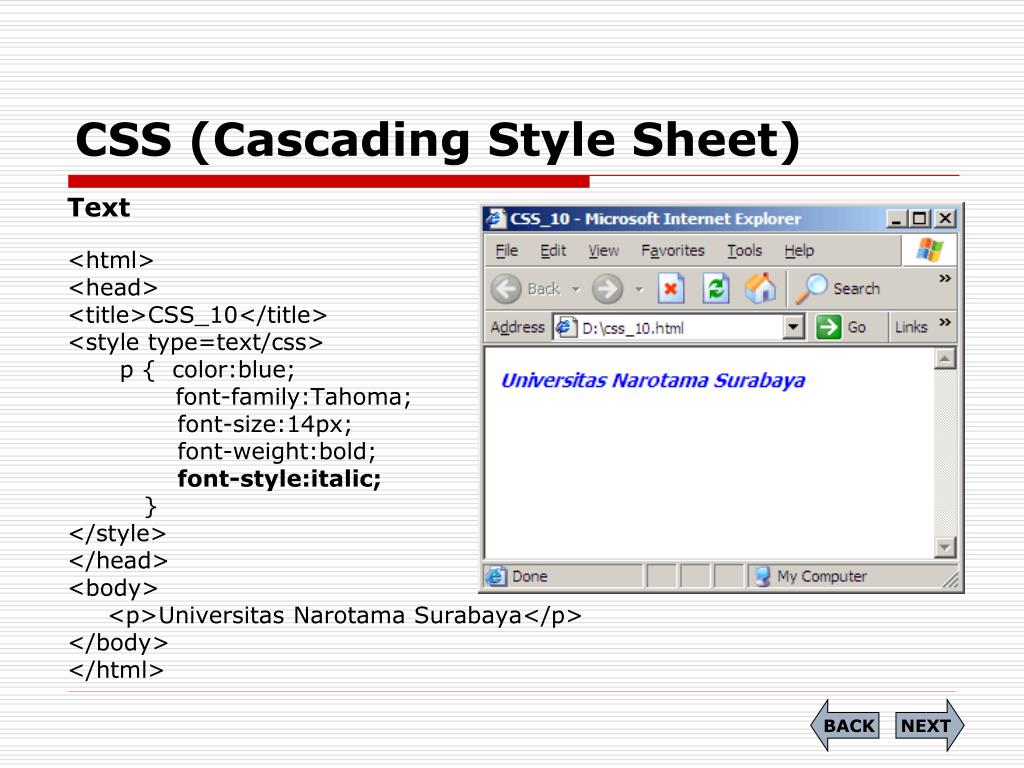 <HEAD> .. . <link rel="stylesheet" type="text/css" href="MyStyle.css"> . . . </HEAD>
