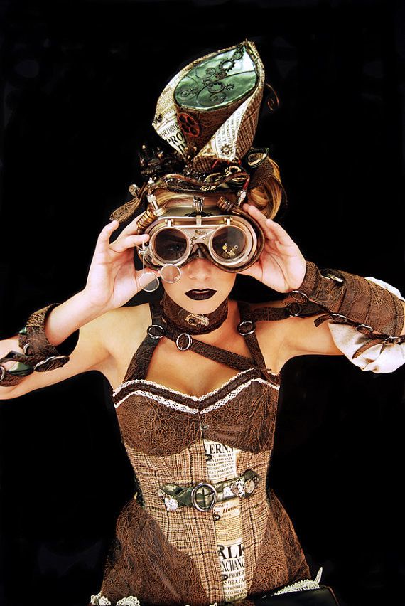 Двумя ключевыми элементами костюма в стиле стимпанк являются снаряжение и очки.Механизм представляет механизм, который он включает; ода технологии и ее возможностям. Очки отсылают к увлечению стимпанка путешествиями; воздушные путешествия, подводные лодки и автомобили требуют очков.