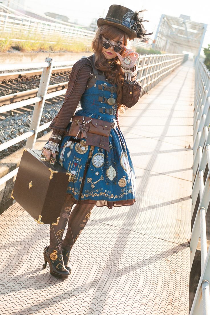 Например, удачно выглядит солдатская шинель с большими пуговицами, куртка-авиатор, викторианское пальто; - юбки — девушки часто носят кожаные штаны, но удачно дополнят образ юбки с турнюрами. Можно носить несколько коротких кружевных юбок для придания объема или юбки с косточками под старину;