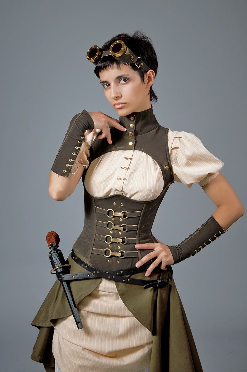 Одежда в стиле стимпанк для девушек требует обязательного присутствия корсета, идеально подчеркивающего женственность и грацию. Его необязательно носить как нижнее белье, оригинально смотрятся модели, выполненные в виде кожаного жилета, застегивающегося на пуговицы.