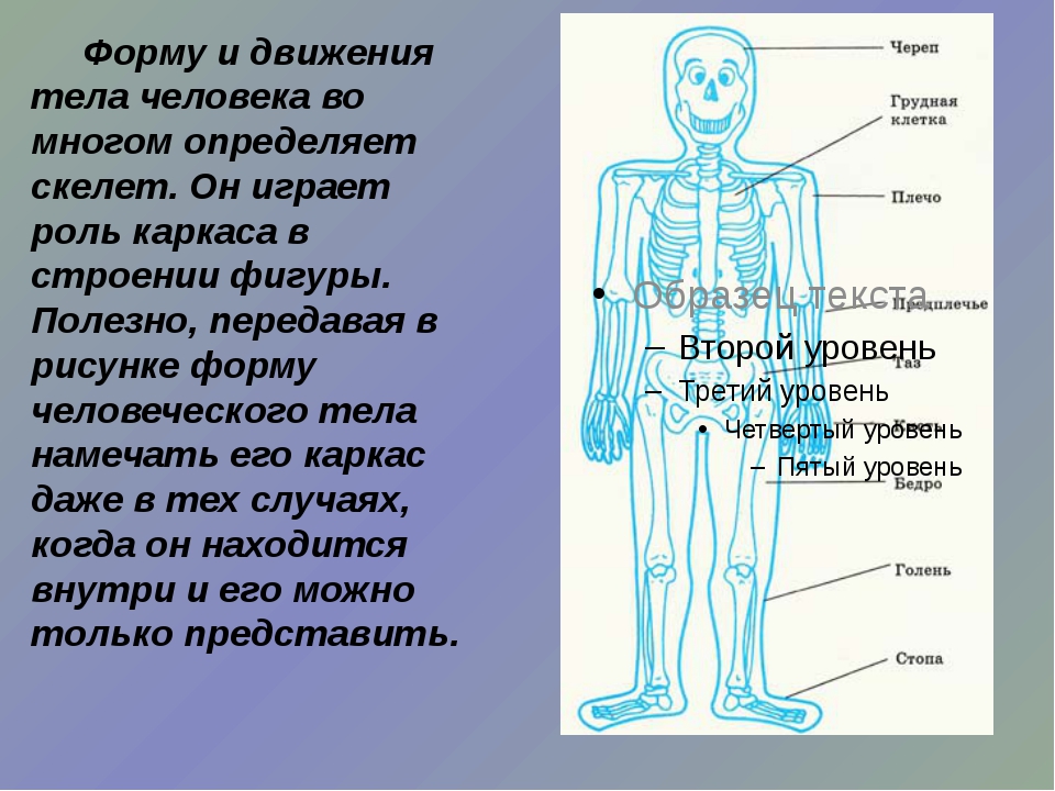 Для того чтобы верно передать образ человека, представить его на полотне в естественном виде, следует изучить строение человеческого тела . Великий художник Леонардо да Винчи придавал такому изучению огромное значение. Он говорил : «Прежде чем ты сделаешь мускулы, нарисуй вместо них нити, показывающие положения этих мускулов, которые своими концами будут кончаться в месте прикрепления мускулов к их кости. И это даёт удобнейшее понятие, если ты хочешь мускулы изобразить все, один над другим. Но если будешь делать это иначе, чертёж твой окажется спутанным».