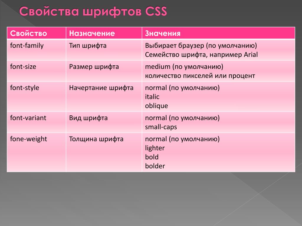 | font-family | Задает семейство шрифтов. Значение по умолчанию зависит от обозревателя |