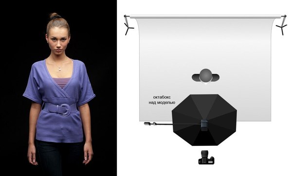 - октобокс (софтбокс восьмиугольной формы) расположен чуть левее камеры, выполняет роль заполняющего и рисующего света. Он полностью освещает модель, при этом формирует светотеневой рисунок;