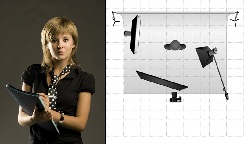 Эта схема отличается от предыдущей расположением вертикальных стрипов. В предыдущем случае они подсвечивали саму модель. В этом они нацелены на задний план. Вариант подходит, если фон недостаточно светлый, белый, выделяющийся. И задача — сделать более светлым, ярким, чтобы объект на его фоне выделялся.