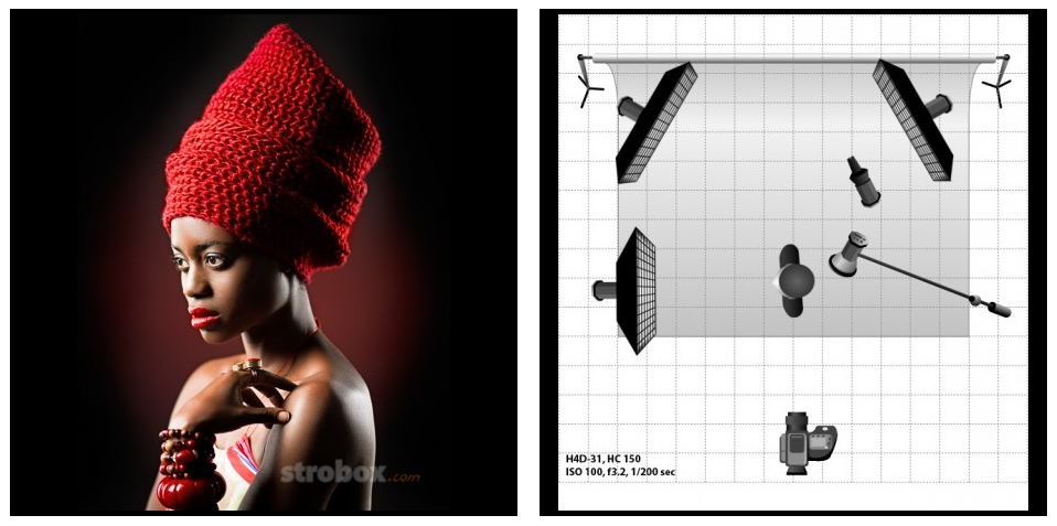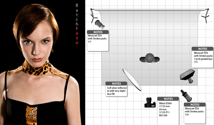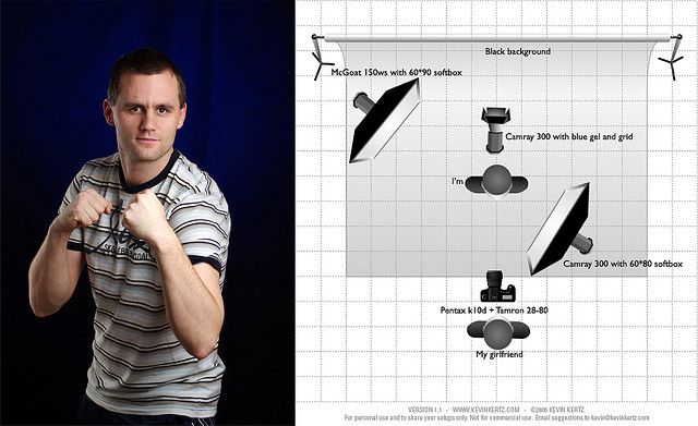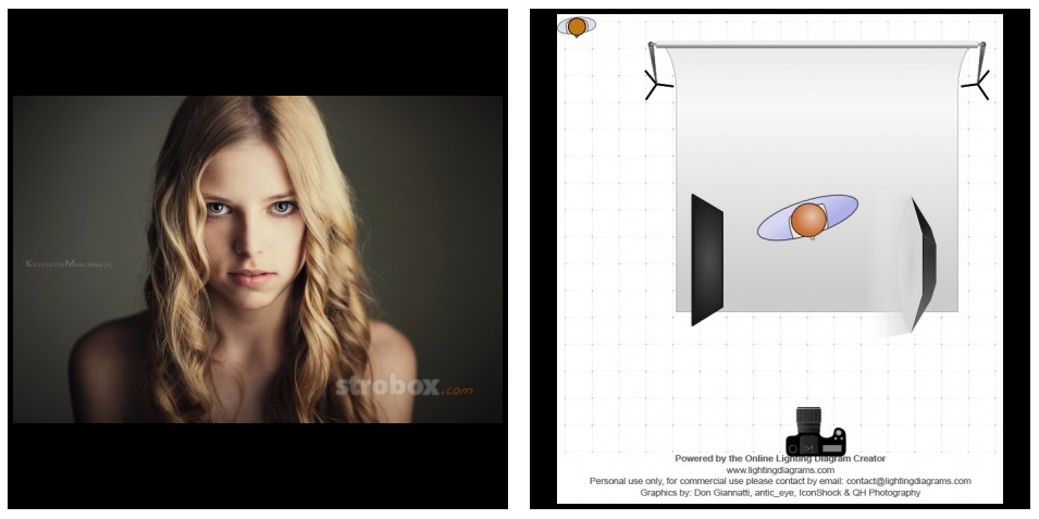 Все источники схемы можно передвигать в стороны, наклонять для достижения оптимального светового эффекта или менять соотношение мощностей источников. Например, ярким рисующим источником (зонт спереди) можно хорошо выделить лицо, более приглушенным – поместить его почти в тень, а основной рисунок получить от контрового света стрипбоксов.