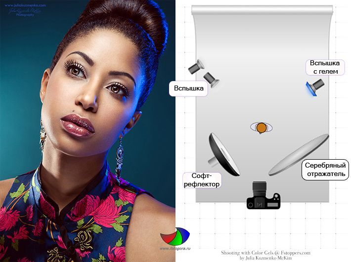 Эта схема дает мягкий свет спереди и контровый с двух сторон, что отлично подходит для красивой обрисовки контуров тела или скул.