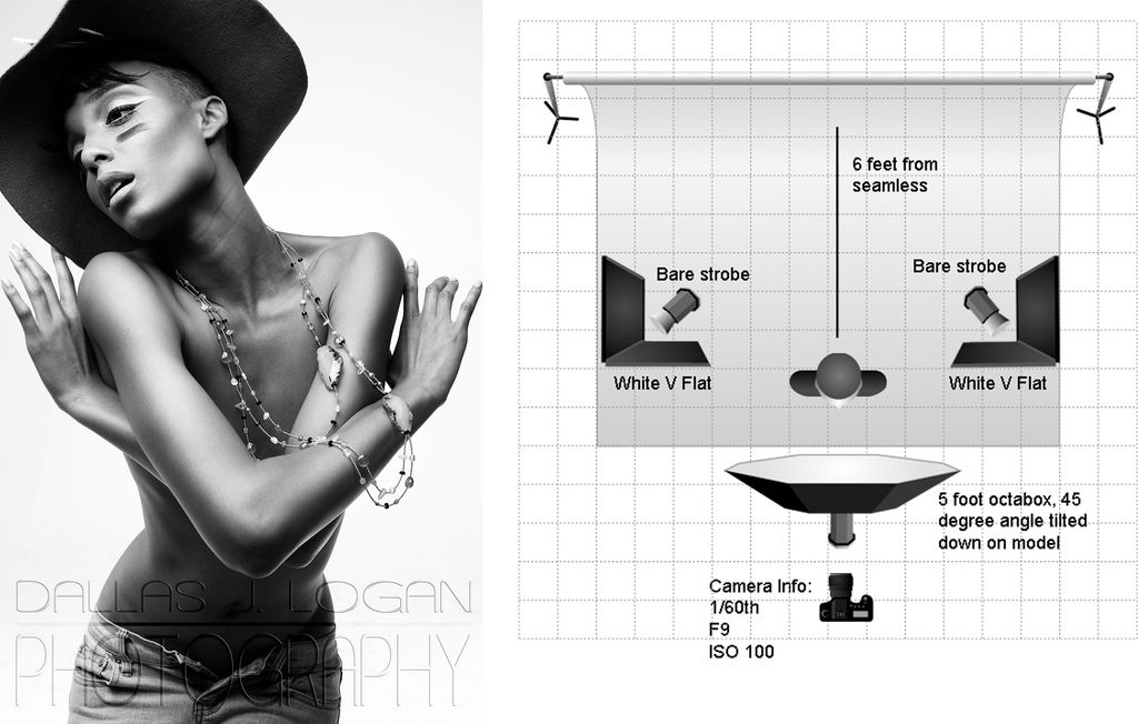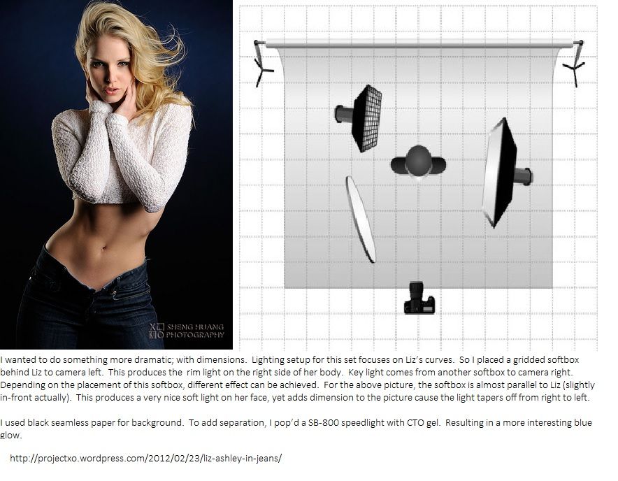 Как этого добиться? Поставить прямо перед моделью 2 больших софтбокса. Задний фон досветить отдельным источником, направив на фон под углом 60 градусов.