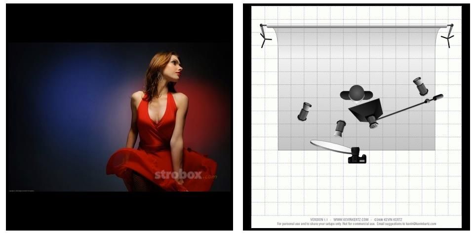 Схема для создания приглушенного освещения фона и обрисовки модели контурным светом. Октобокс и источник со стрипбоксом устанавливаются по диагонали перед и за моделью, как показано на изображении.