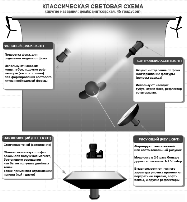 В этой статье подробно разберем 10 базовых световых схем. Освоив их, вы сможете экспериментировать с освещением в студии, модифицировать готовые схемы и создавать новые, наиболее подходящие под конкретную съемку.