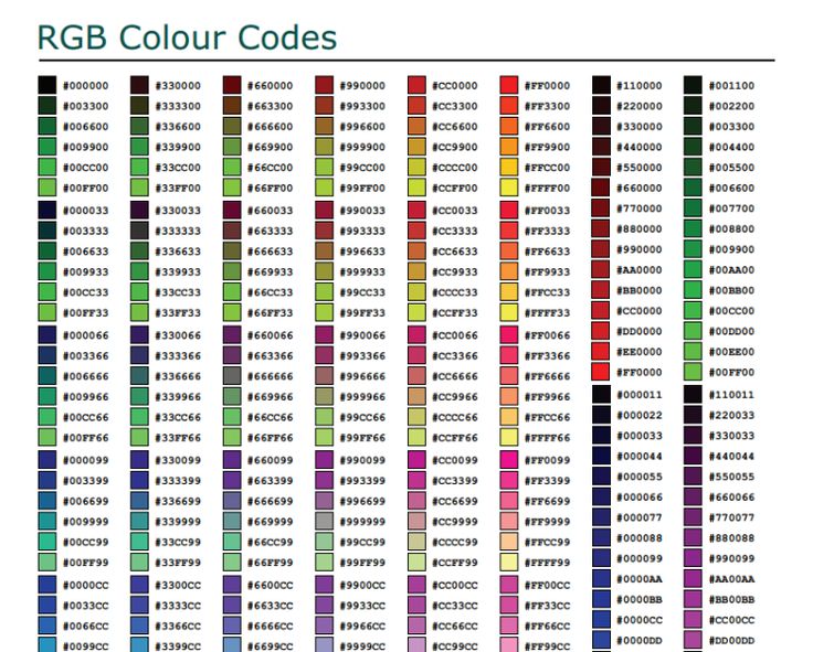 Теперь, когда вы знаете, что такое цветовые коды, возможно, вы ищете вдохновение для своего дизайна. Эти списки с оттенками цветов помогут вам. Они включают названия цветов, коды Hex, RGB и CMYK: