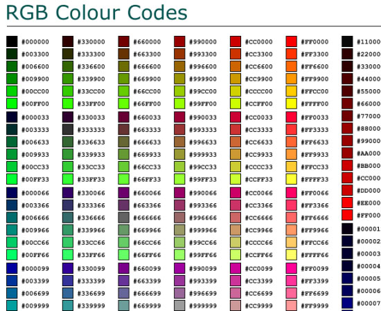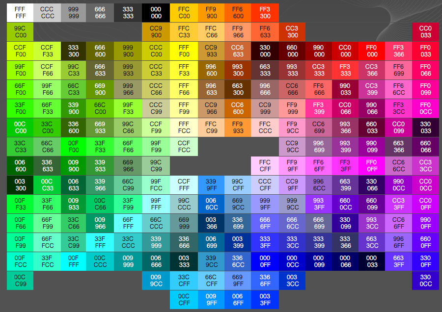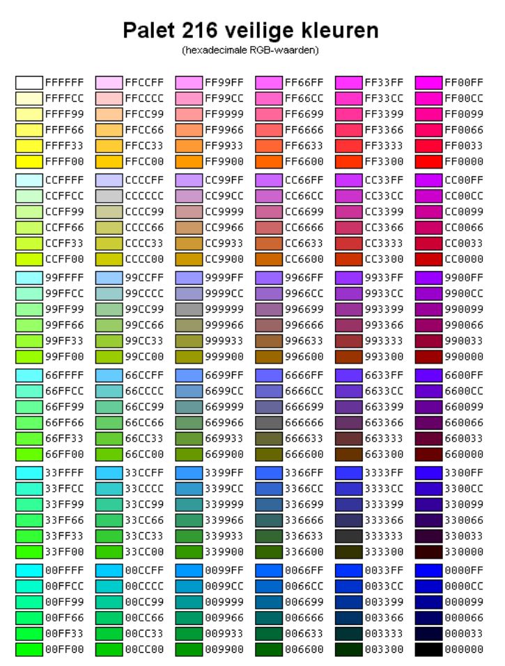 Ниже представлена таблица цветов для так называемого «безопасного» WEB дизайна, эти цвета гарантированно будут верно «работать» на всех типах устройств. Безопасная палитра цветов разработана математическим путем и основная цель таблицы одинаковое отображение цветов используемых в экранном дизайне на мониторах всех пользователей. Таблица состоит из 216 цветосочетаний основных оттенков RGB (red, green, blue)