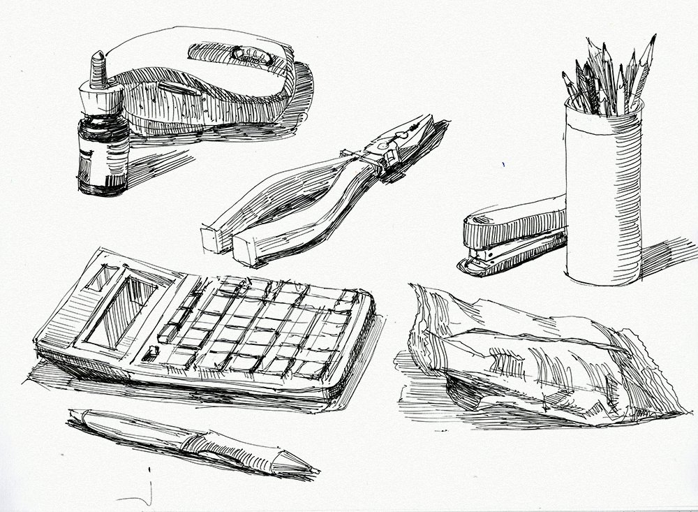 Выберите какой-нибудь простой объект или натуру и постарайтесь решить ее с помощью разных техник затенения. Для начала примените его, чтобы создать разные формы. После этого – обязательно работая лишь одним цветом – попытайтесь с помощью блоков разных тонов (от трех до пяти градаций будет достаточно) передать формы объектов, вне зависимости от того, различимы ли тона на натуре.