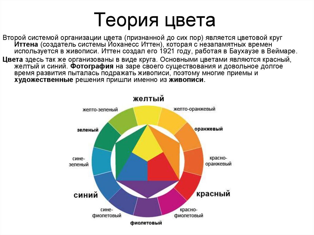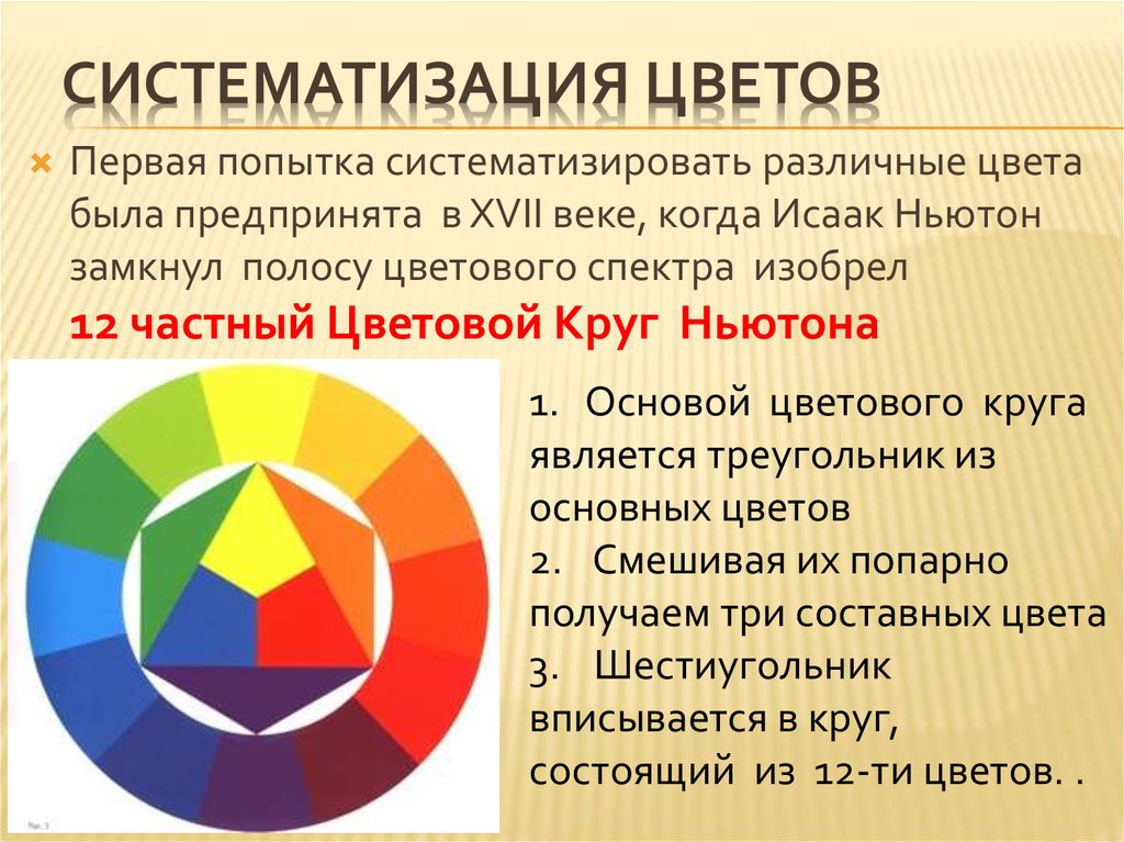 149 г.).0). Первое цветовое колесо было разработано сэром Исааком Ньютоном примерно в начале 17 века. Это цветовое колесо представляло собой сочетание красного, оранжевого, желтого, зеленого, синего, индиго и фиолетового цветов на вращающемся диске.