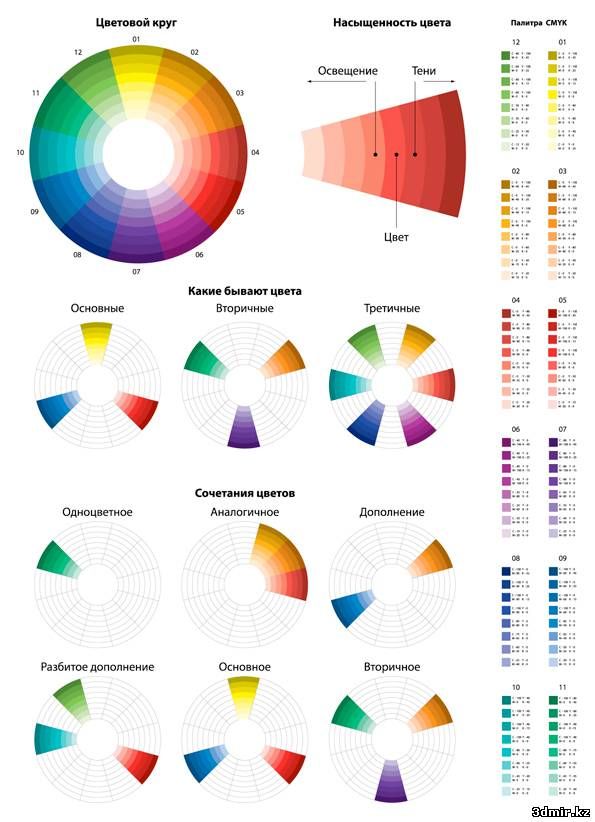 Три основных цвета: красный, синий и желтый. Три вторичных цвета — зеленый, оранжевый и фиолетовый. Они получаются путем смешивания двух основных цветов. Есть еще шесть третичных цветов.