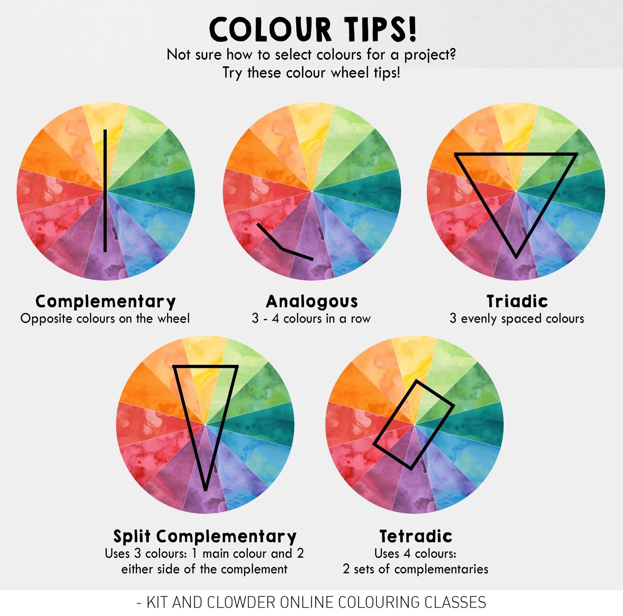 Существует пять цветовых схем, которые позволяют художникам достичь гармонии в своих проектах. Эти цветовые схемы основаны на просмотре цветов на цветовом круге следующим образом: