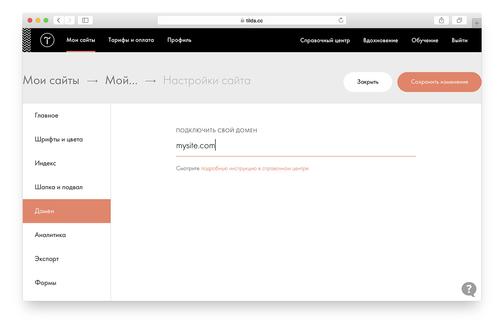 В общих настройках сайта можно подключить домен, подключить платежные системы для интрнет-магазина, подключить сервисы приема данных из форм (Email, Google Sheets/Формы, MailChimp, Telegram, AmoCRM, Битрикс24, UniSender, GetRespons и прочее) и при заполнении формы на сайте, данные будут отправляться в подключенные сервисы.