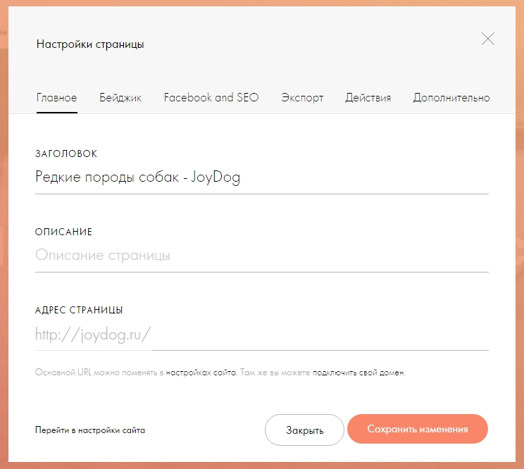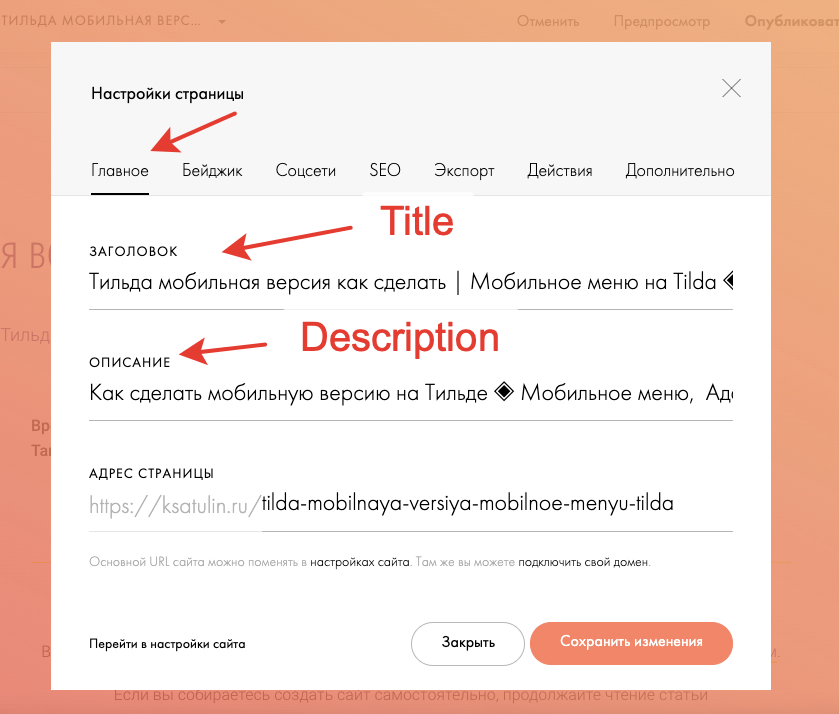 Если вы хотите, чтобы данные для поисковых систем или социальных сетей отличались от тех, что прописаны в настройках страницы, то в настройках страницы перейдите на вкладку «SEO» (или «Соцсети» соответственно), нажмите «Настроить отображение в поисковой выдаче» (или «Настройки отображения в Соцсетях» соответственно). Заполните поля «Заголовок» и «Описание» — они будут выводиться в результатах поиска после следующей индексации сайта.