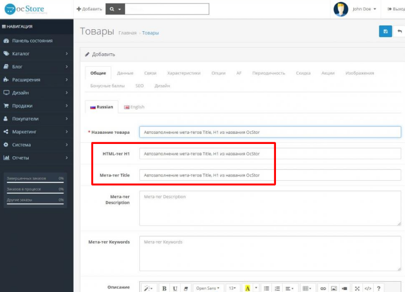 По умолчанию для всех полей (Title, Keywords, Description) в качестве мета-информации используется название магазина.