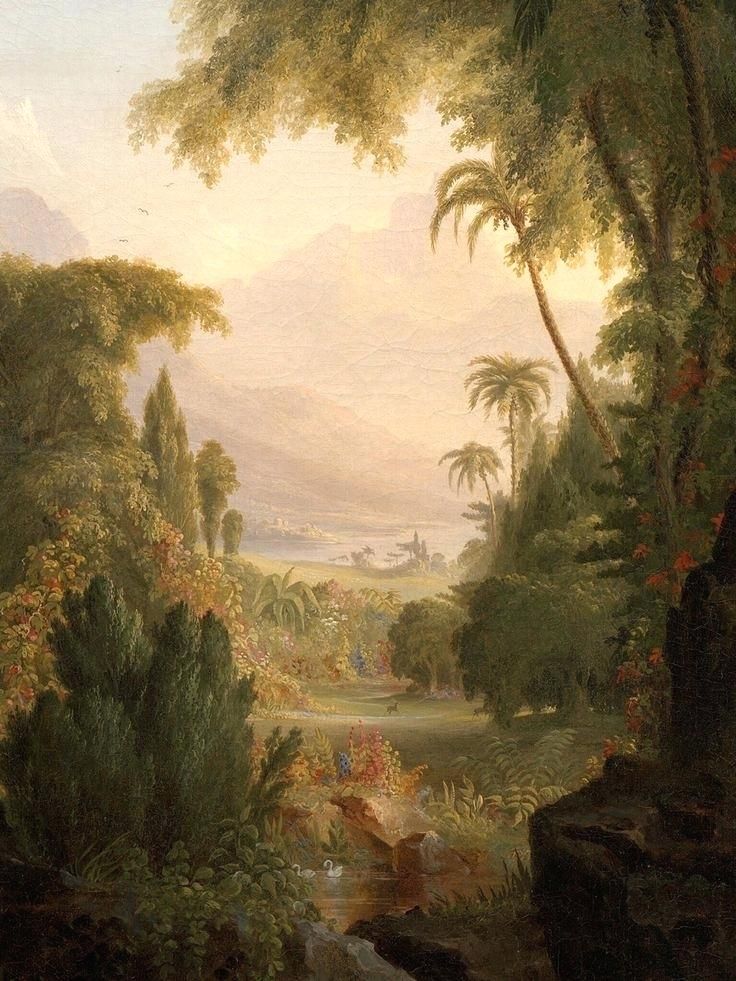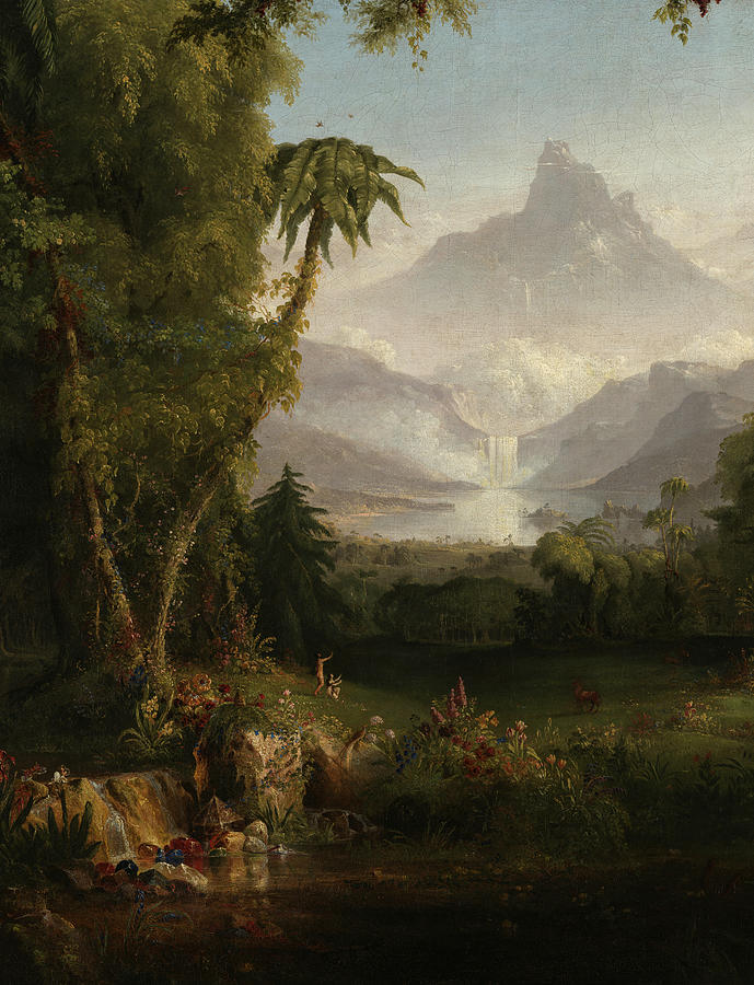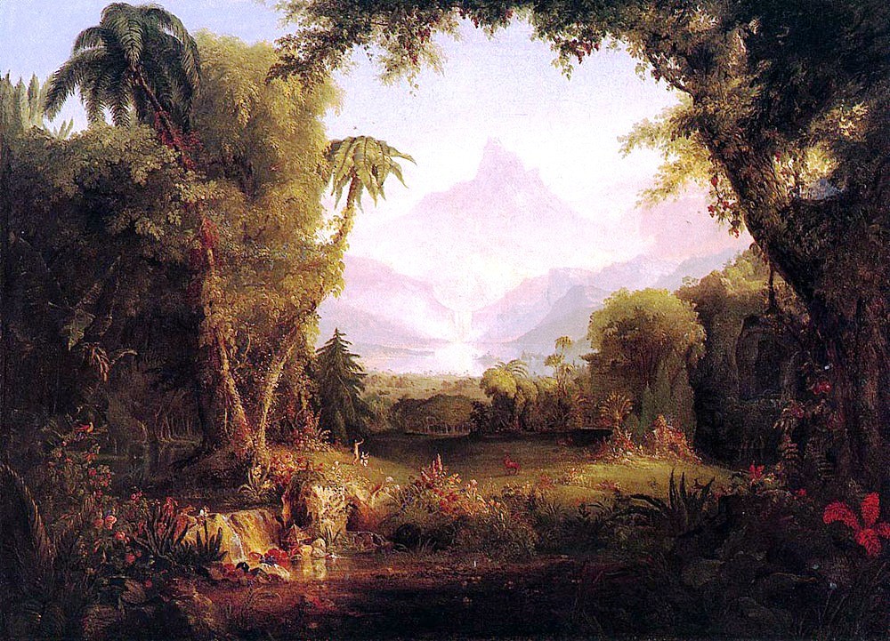 Thomas Cole — из серии «Путь империи» — Первобытное состояние, 1834-1836Источником вдохновения Томаса Коула для создания этой серии стало прежде всего трёхлетнее путешествие по Европе, в котором он увидел музеи со множеством картин романтиков, так и римские руины в Италии.