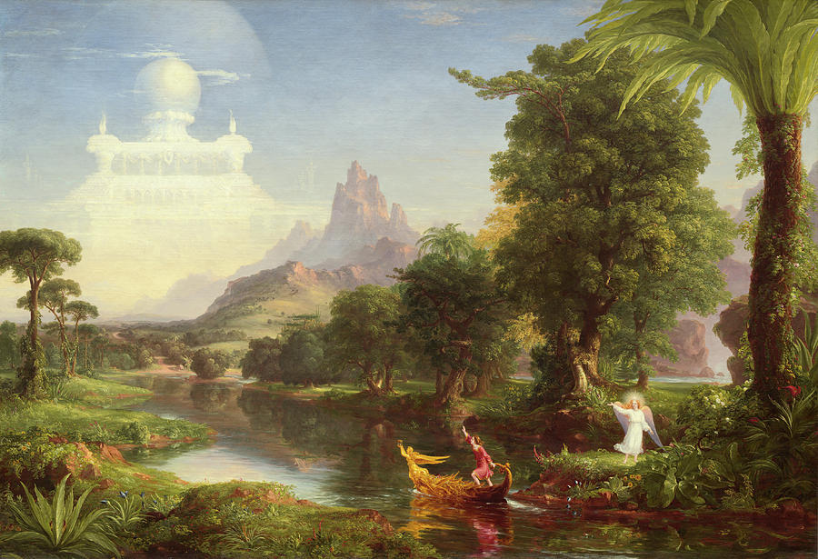 На этой работе изображен молодой человек, плывущий на лодке по усаженной деревьями реке к призрачному белому дворцу в небе; на берегу слева за ним наблюдает ангел-хранитель, предлагая ему защиту в пути. Это вторая из четырех картин, написанных Коулом в 1842 году и изображающих различные этапы аллегорического путешествия человека по жизни. Остальные три представляют детство, зрелость и старость, с повторяющимися композиционными элементами и мотивами, такими как лодка, река и ангел. Четыре этапа человеческой жизни отражены в смене времен года на картинах, природа служит зеркалом эмоционального состояния человека в типичном романтическом стиле.