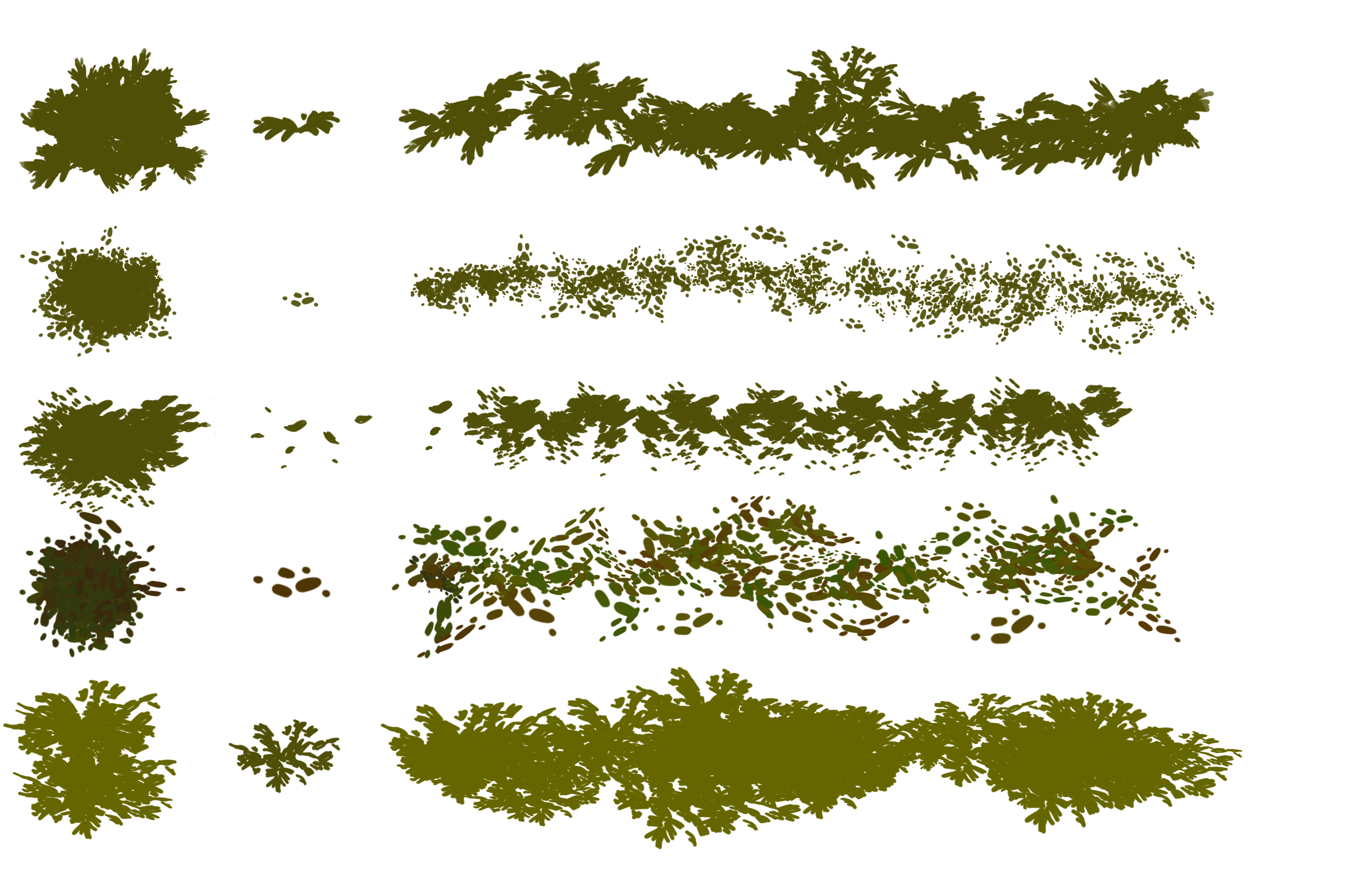 Этот набор содержит три изображения: одно изображение клевера сверху, одно изображение клевера сбоку и одно изображение травы сверху. Для достижения наилучших результатов сначала нарисуйте основной цвет травы с помощью ведра с краской, а затем, немного отличаясь от других тонов, используйте кисть для травы или кисть для клевера, где хотите. Убедитесь, что цвета переднего плана и фона соответствуют цвету травы, иначе это может выглядеть жутковато.