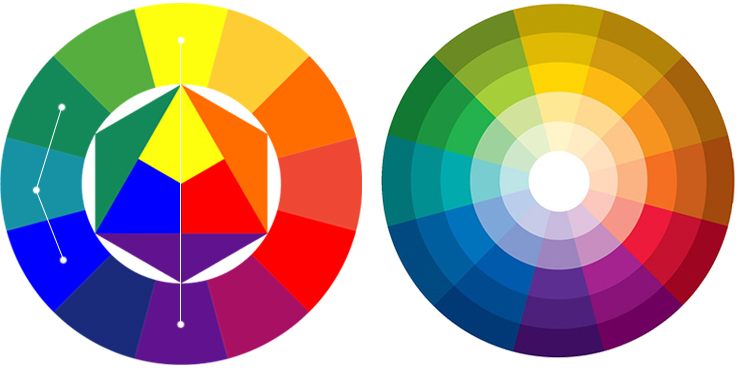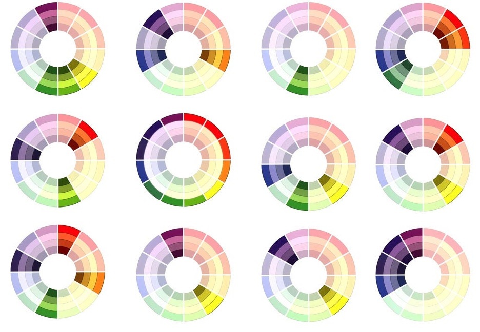 Для подбора оттенков можно также использовать цветовой круг Иттена, добавив к основным цветам более и менее насыщенные оттенки. При этом определяют главный цвет композиции и подбирают к нему подходящую палитру из менее насыщенных оттенков.