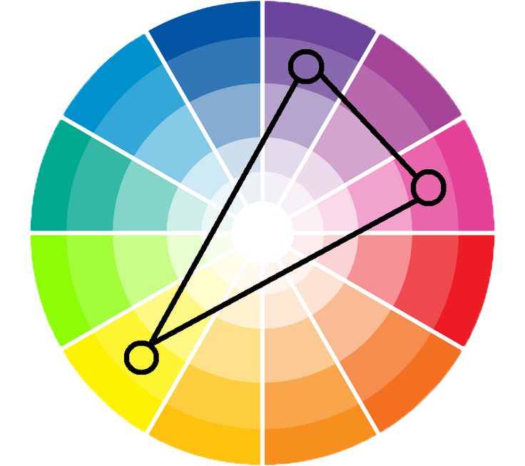 Как используют. Если нужно приглушить контраст дополнительных цветов или расширить палитру. Один цвет выбирают как основной, а два других на противоположной стороне круга — как дополнительные.