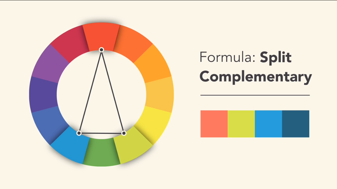 - Схемы Split-Complementary размещают основной цвет на одной стороне цветового круга и два вторичных цвета, которые находятся между основным и его дополнением, на другой стороне.