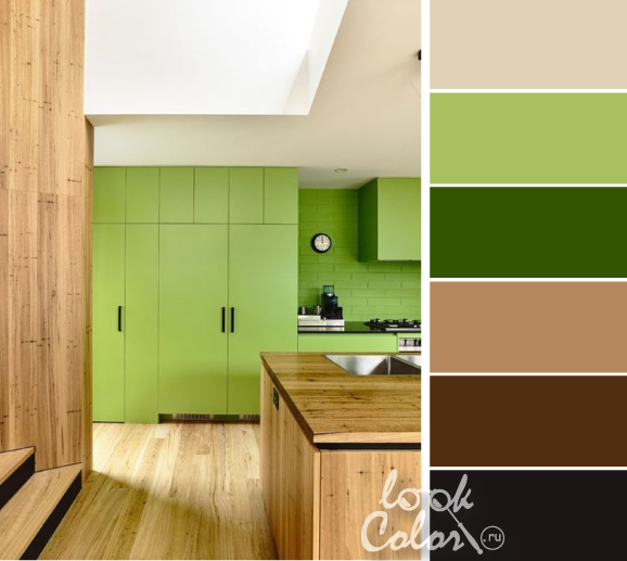 При этом не стоит добавлять слишком много черного, чтобы он не стал доминирующим цветом и не вытеснил салатовый. Коричневый. Зеленые оттенки отлично дополняются коричневыми. К примеру салатовые подвесные шкафчики отлично дополнятся полками из натурального дерева без обработки. При этом подойдут как темные, так и светлые оттенки коричневого. Что может сочетаться с цветом травы и листьев лучше, чем коричневый.