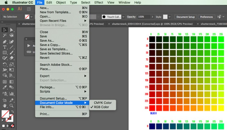 Если документ находится в режиме RGB, выберите «Файл» > Цветовой режим документа > Цвет CMYK, чтобы преобразовать его в CMYK. Режим.