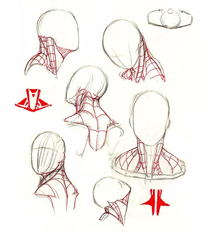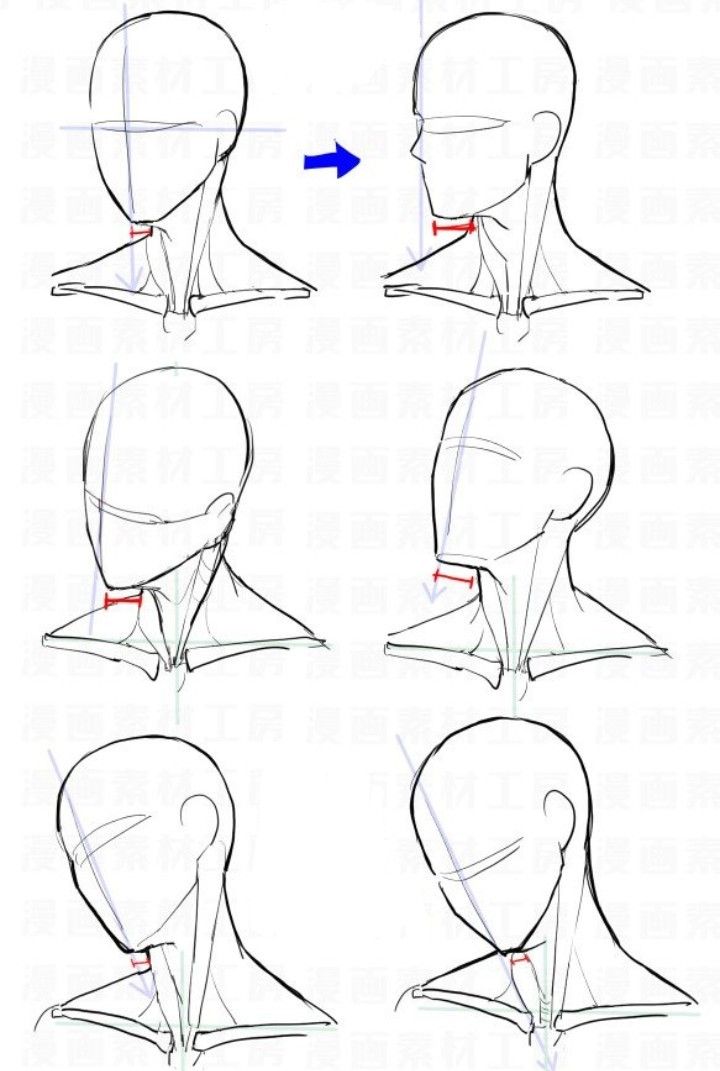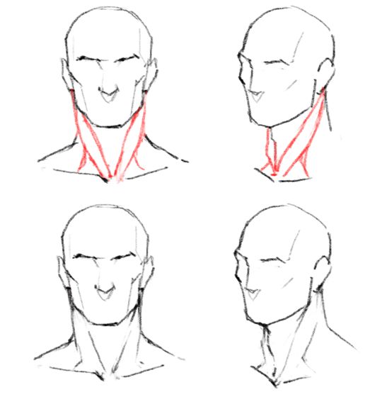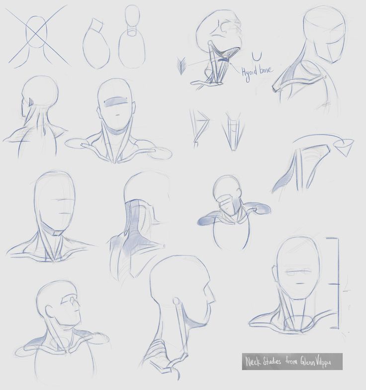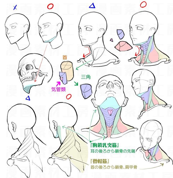 1. Рисуем кружок, к нему добавляем дугу и челюсть. Добавляем цилиндр шеи, ищем у нее две опорные точки — яремную ямку и седьмой шейный позвонок.