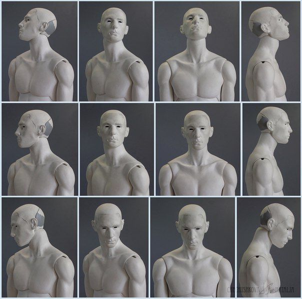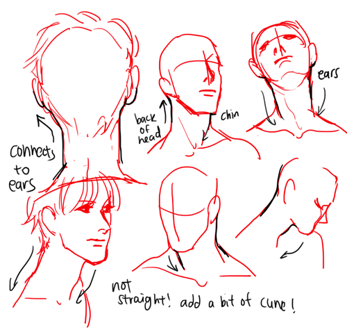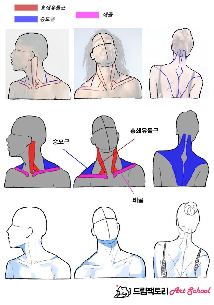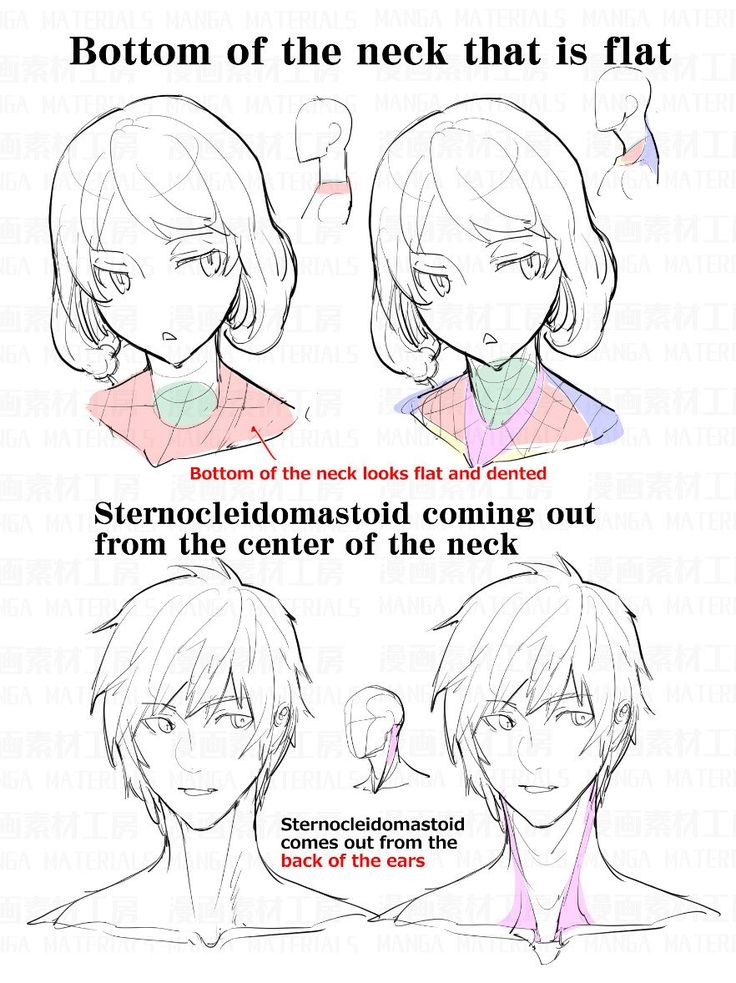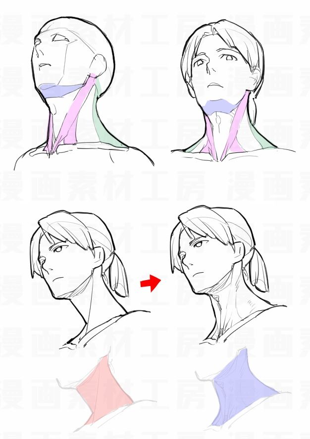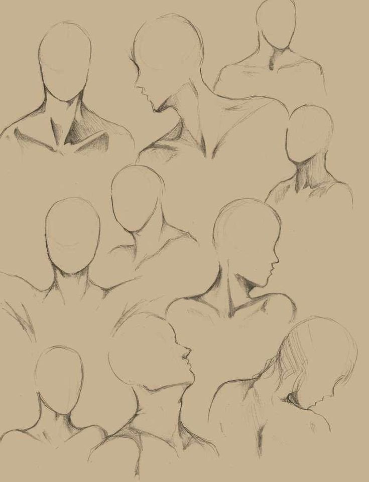 1. Рисуем кружок, к нему добавляем дугу и челюсть. Добавляем цилиндр шеи, ищем у нее две опорные точки — яремную ямку и седьмой шейный позвонок.