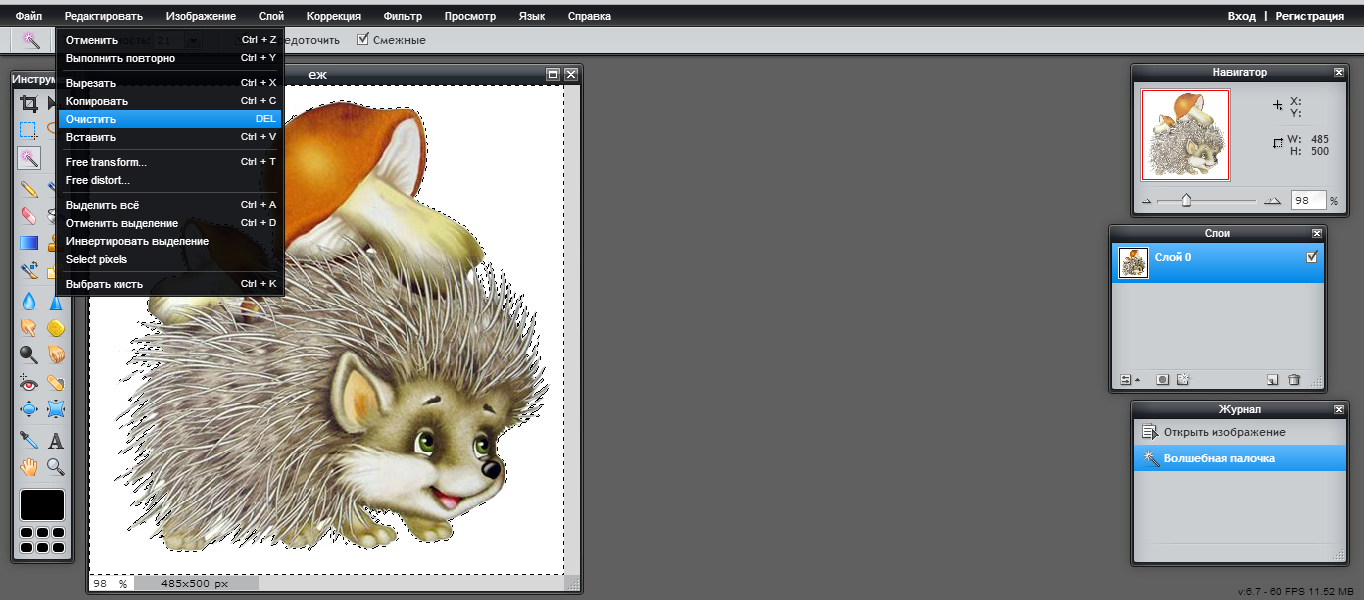 Шаг 3: С правой стороны вы увидите опцию «Стереть». Нажмите «Волшебная палочка», а затем нажмите на фон изображения. Он отметит фон, затем нажмите «Удалить пиксели». Если фон выделен не полностью, вы можете снова использовать инструмент на этой части, чтобы пометить его. Повторяйте процесс, пока не будет выделен весь фон.