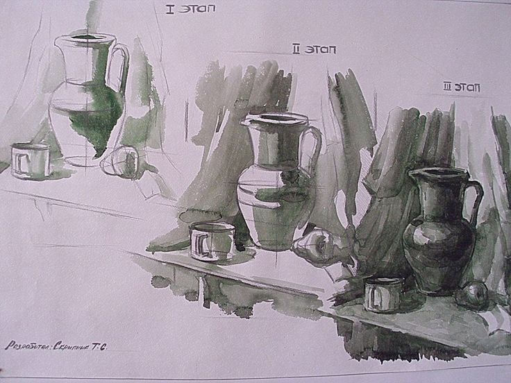 Задачи: Компоновка рисунка в листе, последовательное – поэтапное ведение рисунка в цвете, грамотное сочетание цветовых отношений, лепка формы предметов, передача световоздушной среды.