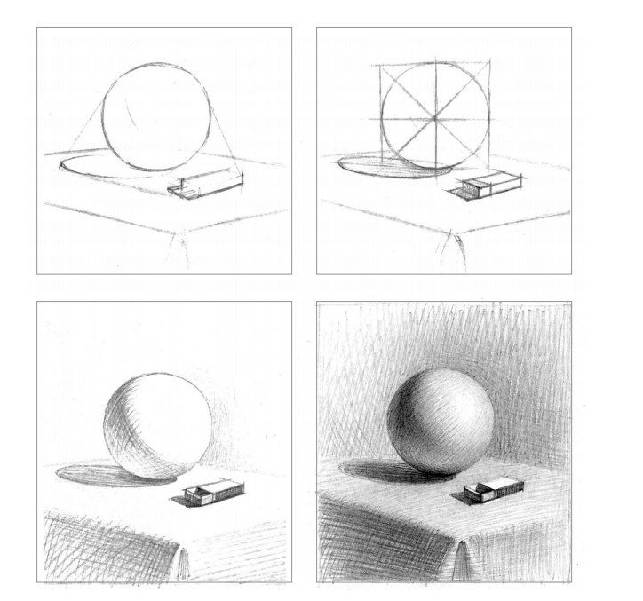 - Рисуем квадрат примерно посредине листа. Не старайтесь нарисовать его четырьмя идеальными линиями, от одного угла до другого, штрихи могут выходить за границы угла, пока линии не образуют ровный квадрат. Вписываем в квадрат круг. Движение лучше делать широким, от локтя, а не от кисти, так будет проще сделать ровную линию, стороны круга, должны касаться сторон квадрата. Не пытайтесь сразу нарисовать ровный круг, чем больше дополнительных линий вы нарисуете в поиске правильной формы, тем лучше. Далее штрихуем круг диагональными линиями справа налево и слева направо.