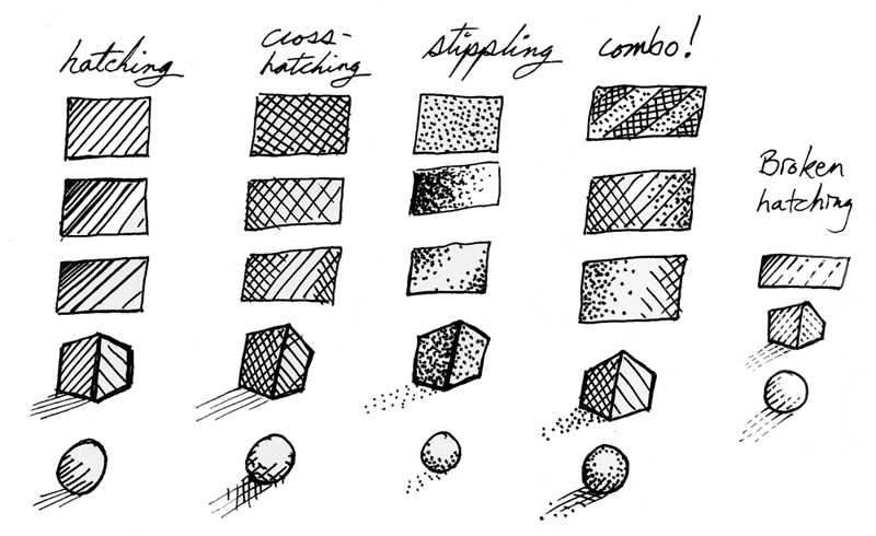 При использовании тушевки штрихи получаются с наложением друг на друга. Если вы не хотите, чтобы на рисунке проявилась текстура бумаги, то не используйте тушевку при создании полутонов или рисуйте на абсолютно гладкой бумаге. При штриховке между линиями есть небольшие промежутки. Штриховка позволяет лучше передать полутона. Чтобы увеличить интенсивность, мы можем усилить нажим, нарастить толщину проводимых линий, сократить пробелы и выполнять штриховку в нескольких направлениях.