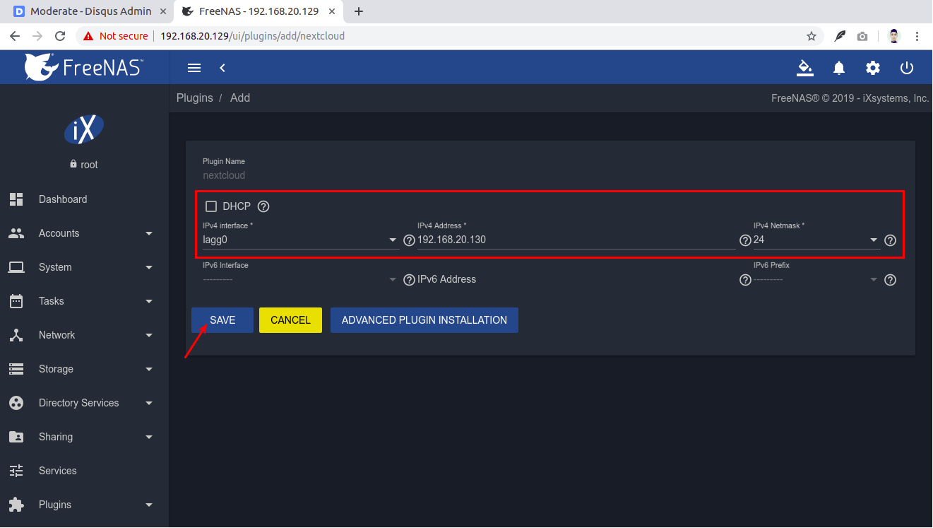 Первым делом заходим на WEB-панель FreeNAS по IP который мы только назначили.