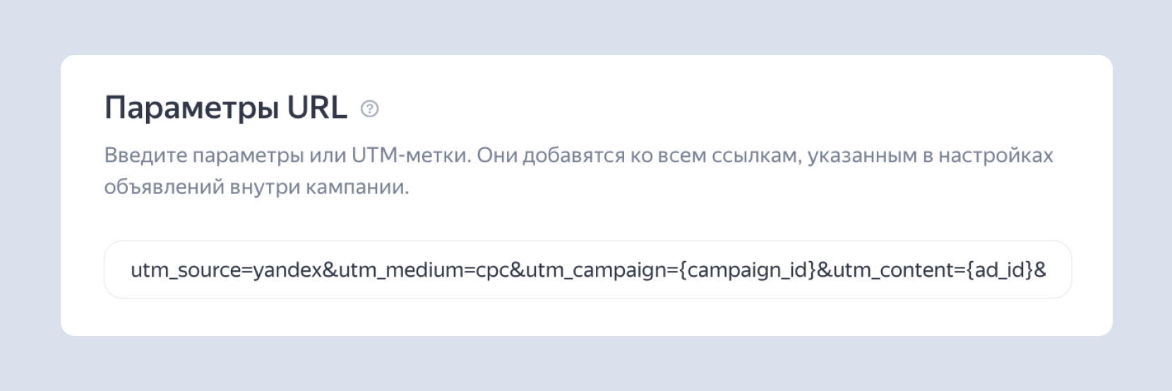 Для новой группы объявлений укажите другую UTM-метку и добавьте её таким же способом.