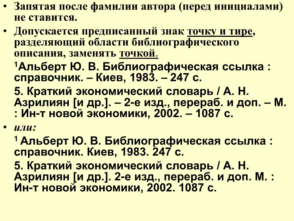 1-2003, который введен в действие с 2004 года. По требованиям к публикациям в научной прессе библиографические списки и ссылки должны быть оформлены по стандарту. Да, этот стандарт предполагает запятую после фамилии перед инициалами автора. Это, да и другие нововведения стандарта, были приняты для сближения с международным стандартом на БО.
