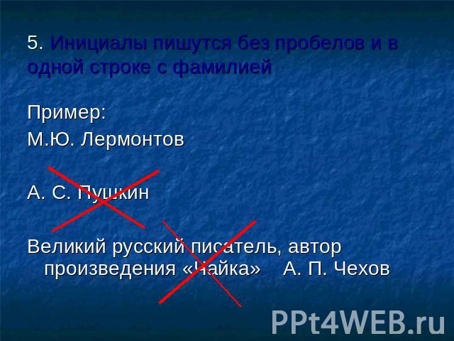При написании инициалов нужно учитывать, что отрывать их от фамилии нельзя, то есть инициалы и фамилия всегда должны быть на одной строке. Поэтому при наборе текста на клавиатуре компьютера предпочтительнее ставить неразрывный пробел (Ctrl + Shift + пробел) вместо обычного, чтобы не возникло ситуации, когда инициалы остаются на одной строке, а фамилия переносится на другую. К слову сказать, именно этим и отличается профессиональный набор текста от дилетантского. Грамотный наборщик сделает так, чтобы инициалы не отрывались от фамилии и не переносились на другую строку, даже если между ними стоит пробел.