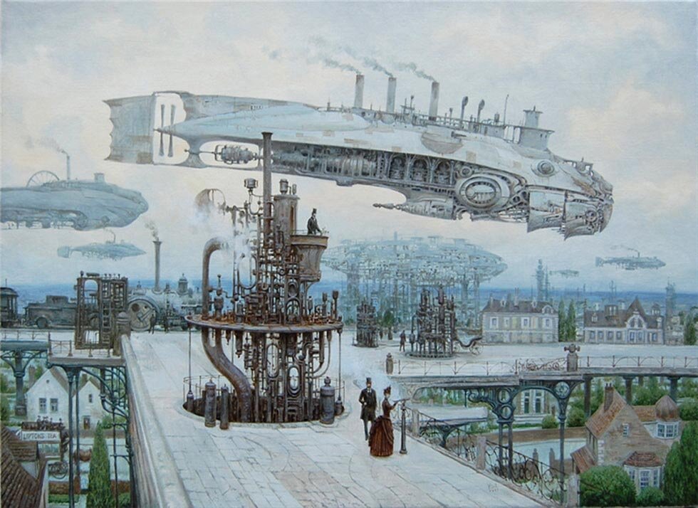 Как выглядели бы города, если бы человечество пошло по пути развития паровых машин вместо использования электричества и двигателей внутреннего сгорания? Об этом размышляет в своих работах белорусский художник Вадим Войтехович.