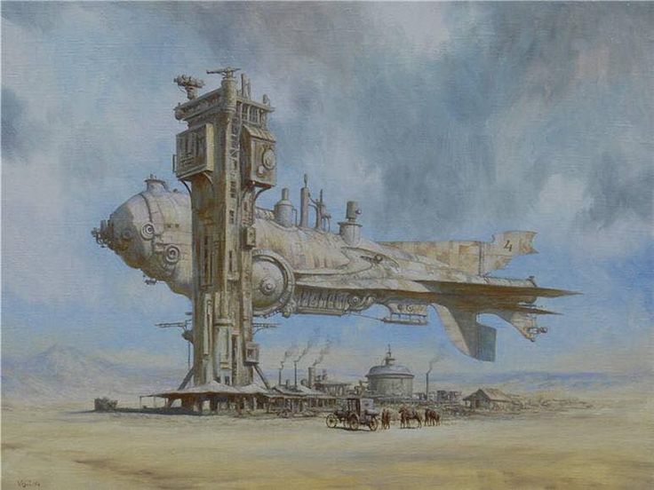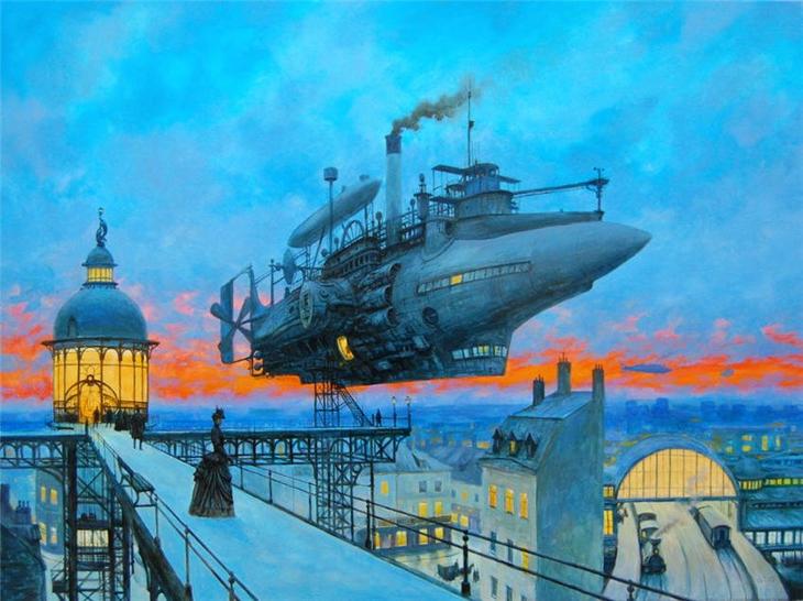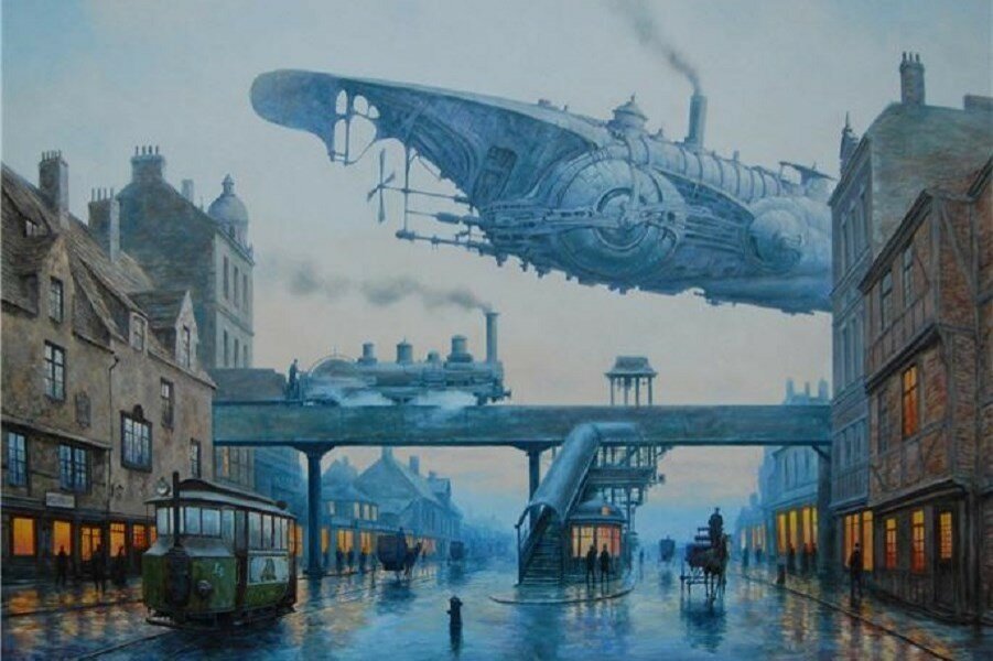Как выглядели бы города, если бы человечество пошло по пути развития паровых машин вместо использования электричества и двигателей внутреннего сгорания? Об этом размышляет в своих работах белорусский художник Вадим Войтехович.