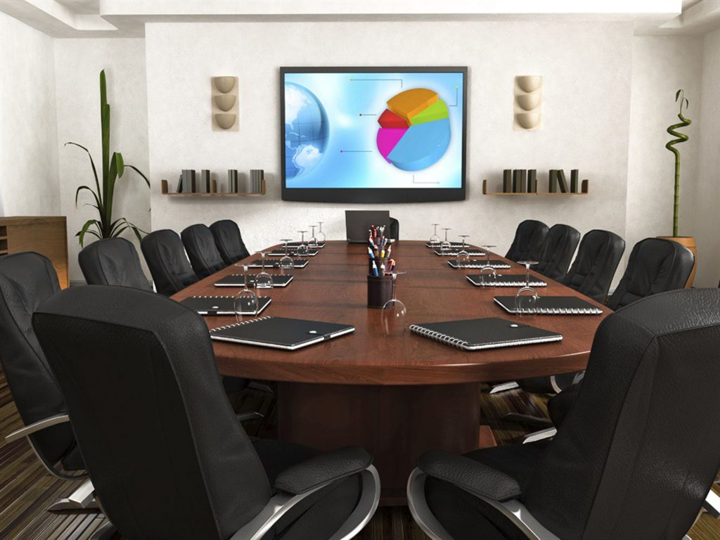 Для эффективного соединения вашей небольшой комнаты переговоров с внешним миром вам потребуется система видеоконференции. Для того чтобы получаемое изображение было хорошо видно всем, присутствующим участникам потребуется монитор с диагональю не менее 32″.