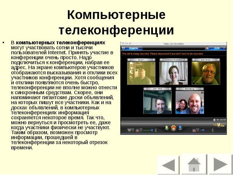 В простейшем случае видеоконференция обеспечивает передачу статических изображений и текста между двумя точками. В самом сложном варианте он обеспечивает передачу полномасштабных видеоизображений и высококачественного звука между несколькими точками.
