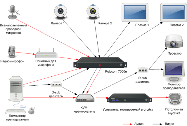 к. в конференции с каждой стороны может принимать участие до 20 участников. Воспроизводить изображение желательно на большом экране, а для участников предусмотреть микрофоны.Варианты оборудования: